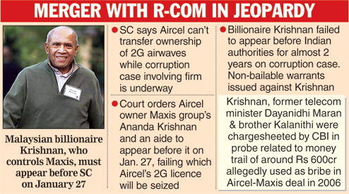 In September, a special CBI court in Delhi had issued bailable warrants against Krishnan, a Malaysian citizen, as an accused in the Aircel-Maxis money-laundering case.