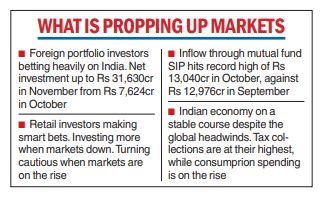 Benchmark indices are expected to maintain their record-breaking run egged on by retail investors and the return of foreign portfolio investors (FPIs), which have made a net investment of more than Rs 31,600 crore so far in November.