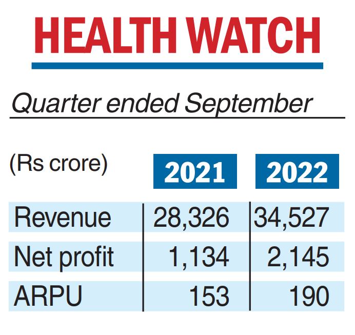 Total revenue rose 22 percent year on year to Rs 34,527crore during the just-ended quarter, according to a statement. Average Revenue Per User (ARPU) for the quarter stood at Rs 190 as compared with Rs 153 in Q2 FY22.