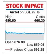 The Sunil Mittal-led firm saw its stock tumble 5.03 per cent, or Rs 34.95, on the BSE to end at Rs 660.30.
