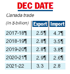 India’s merchandise exports to Canada rose 26 per cent until February last fiscal from a year before to $3.6 billion, while Canada’s rose 14 per cent to $2.9 billion.