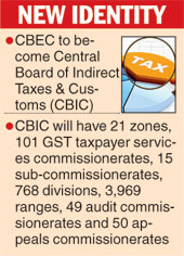 The All-India CBIC, which in essence would be an expanded version of CBEC, will have some 21 zones, 101 GST taxpayer services commissionerates, 15 sub-commissionerates, 768 divisions, 3,969 ranges, 49 audit commissionerates and 50 appeals commissionerates.