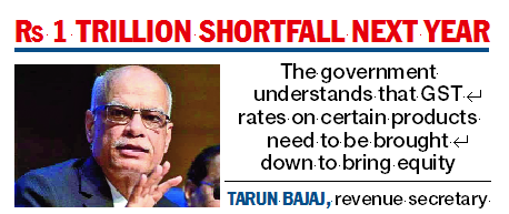 Revenue secretary Tarun Bajaj has said that states could face a GST revenue shortfall of Rs 1 lakh crore in the next fiscal. Under the system that is currently in place, it is obliged to compensate for the shortfall only till the end of June.