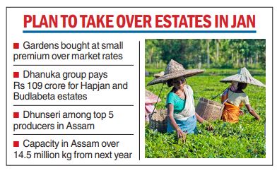 Dhunseri is offering to pay Rs 109 crore for the gardens — Hapjan and Budlabeta — which are capable of producing 3.1 million kg annually at a valuation of Rs 350 a kg.