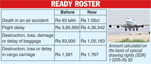 Under the law, the compensation for death in an air accident will be increased to over Rs 1 crore from almost Rs 89 lakh now. The amount will be calculated on the basis of SDRs (special drawing rights). The bill intends to raise the liability limit for damage in case of death or bodily injury for each person to 1,13,100 SDR from 1,00,000 SDR.