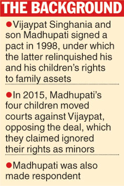 The judges were hearing an appeal filed by four grandchildren of Vijaypat Singhania against a single judge order of August 2015 of the Bombay high court that refused an interim relief to them in a suit they filed seeking a share in the family property.