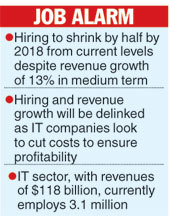 'Despite a healthy revenue growth of 13 per cent for IT services foreseen in the medium term, aided by recovery in discretionary spending by clients, recruitments will shrink by around halve by fiscal 2018 (from the current levels) with vendors focusing on cost optimisation by maximising revenue-per-employee,' the Crisil report said.