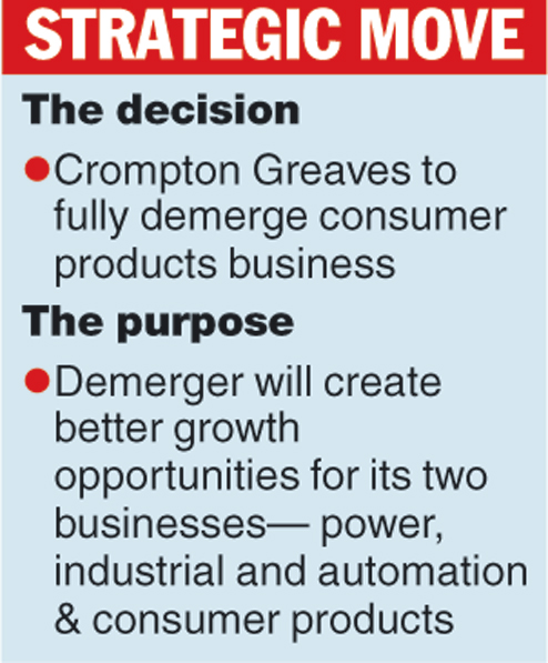 Mumbai, Feb. 19: Power equipment maker Crompton Greaves Ltd's board has approved the demerger of its consumer products business, the company said on Thursday.