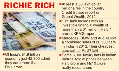 Car makers Mercedes, BMW and Audi reported a combined sales of nearly 26,500 cars in India in 2012. Their cheapest cars sell for Rs 27 lakh. Not hard to surmise, a person who buys a car that costs that much would be earning at least three to four times that figure.