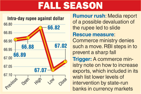 New Delhi, Sept. 15: Reports that the commerce ministry was considering a calibrated devaluation of the rupee to make exports more competitive sent the Indian currency reeling today, prompting the North Block to deny any such move and put in motion a salvage operation by state-run banks.