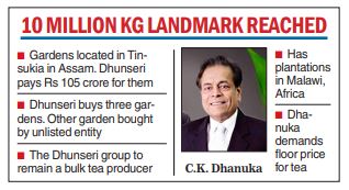 The Dhunseri group, promoted by Chandra Kumar Dhanuka, has snapped up four tea gardens in Assam from Warren Tea Ltd, joining a handful of Indian planters to have more than 10 million kilograms of own crop.