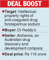 Mumbai, Sept. 25: Dr Reddy's Laboratories (DRL) is acquiring the global intellectual property rights of the generic anti-coagulant drug fondaparinux sodium from Alchemia, an Australian drug discovery and development company, for Rs 116 crore.