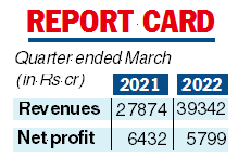 During the quarter, revenues rose to Rs 39,342 crore from Rs 27,874 crore in the year-ago period.