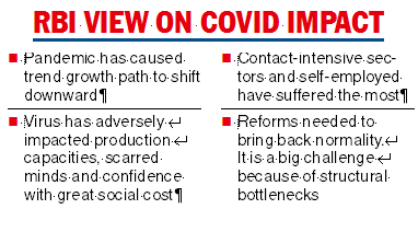 The RBI added that the virus has caused a deep dent on livelihoods and has “scarred minds, production capacities and confidence with far-reaching economic and social costs’’, and the post pandemic new normal may be very different from the situation that prevailed before the coronavirus raged across the world.