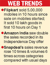 New Delhi, Oct. 15: E-commerce giants such as Amazon, Flipkart and Snapdeal are dealing out deep discounts through flash sales and exchange offers to attract shoppers who are expected to shell out Rs 40,000 crore to shop online during Durga Puja and Diwali, according to industry estimates.