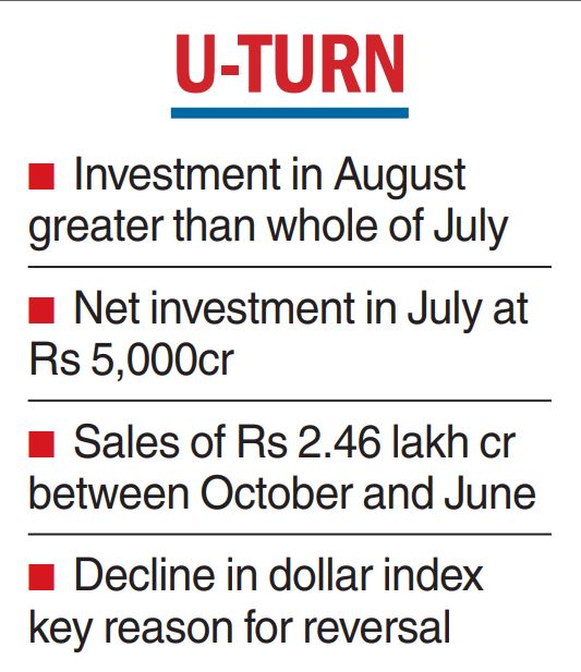 This was way higher than the net investment of nearly Rs 5,000 crore by them in entire July, data with depositories showed.