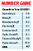 Financial, real estate and professional services growth stood at 4.6 per cent in Q3 FY22 compared to a growth of 10.3 per cent. Public administration, defence and other services grew at 16.8 per cent during the quarter under review compared to 2.9 per cent contraction a year earlier.