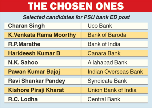 The appointees today were interviewed in December by a government-appointed selection panel headed by Reserve Bank of India governor Raghuram Rajan. The panel had interviewed 35 candidates to fill the vacancies of 14 executive directors (ED) in various public sector banks.