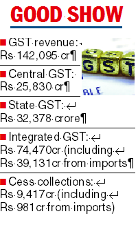 Out of the gross GST revenue of Rs 142,095 crore, central GST accounted for Rs 25,830 crore, state GST at Rs 32,378 crore, and integrated GST at Rs 74,470 crore (including Rs 39,131 crore collected from import of goods).