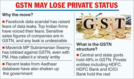 The move is partly motivated by data security concerns, which have rattled the government after the Facebook leaks. Top companies whose sensitive sales figures are processed through the GSTN network have quietly asked the government to plug possible data leaks and do security audit to ensure their sensitive information does not fall prey to rivals' eyes.