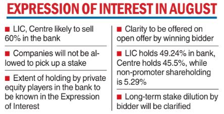 Since the government andLIC are together looking to sell around 60 percent, they EoIwill specify to bidders whether they can acquire over 51 percent stake in the bank through a competitive bidding process if they meet the eligibility criteria.