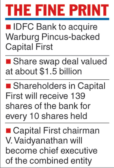Mumbai: IDFC Bank, one of India's two newest banks, will acquire non-bank financial firm Capital First in a share swap deal valued at about $1.5 billion as it looks to boost its retail lending activities.