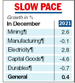 “Belying our expectations of a mild uptick, the YoY (year-on-year) IIP growth crumbled to a marginal 0.4 per cent in December 2021, partly on account of an unfavourable base. The contraction in capital goods, consumer durables and consumer non-durables, along with a feeble growth in the remaining categories add heft to the MPC’s decision to remain growth supportive in light of the incomplete recovery,” Aditi Nayar, chief economist, Icra said.