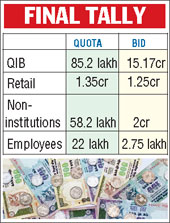 The QIB category was subscribed nearly 18 times with bids for over 15.17 crore shares. There was also a pick-up in the interest among retail investors. The retail portion, which received bids for 1.25 crore shares, was subscribed nearly 90 per cent.