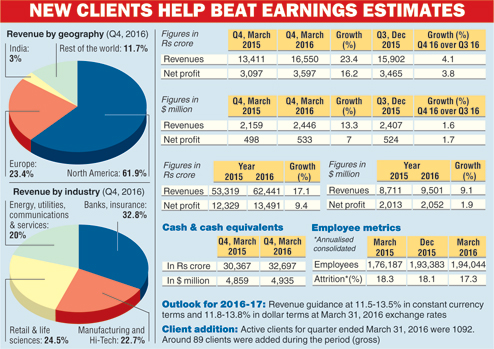 Mumbai, April 15: Infosys, India's second-largest IT services company, has forecast strong revenue growth and reported its third successive estimate-beating earnings on new client wins, solidifying a recovery that began a year ago under its new chief executive.