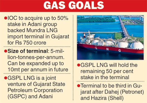 New Delhi, Aug. 4: Indian Oil Corporation will acquire up to 50 per cent in the Adani group-backed Mundra LNG import terminal in Gujarat for about Rs 750 crore.