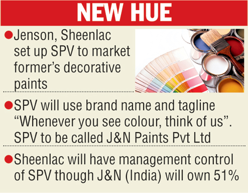 The joint venture will be in the form of a special purpose vehicle (SPV) called Jenson and Nicholson Paints Pvt Ltd. Though Jenson and Nicholson will own 51 per cent of the venture, Sheenlac will have management control. Jenson and Nicholson (India) Ltd (JNIL) will transfer 150 staff members to the new entity. Over the next five years, Rs 50 crore will be infused into the venture, which will market and sell JNIL's decorative paints.