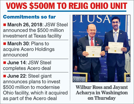 Calcutta: Betting big on President Donald Trump's "Buy American" drive, JSW Steel has committed fresh investment of $500 million to the US, taking a pledge to pour in over a billion dollar into steel making facilities in Ohio and Texas.