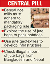 Calcutta, Oct. 19: The Union textile ministry has asked the Bengal government to generate additional demand for jute bags within the state and provide administrative support to the jute commissioner to prevent illegal import of jute products from Bangladesh and Nepal.