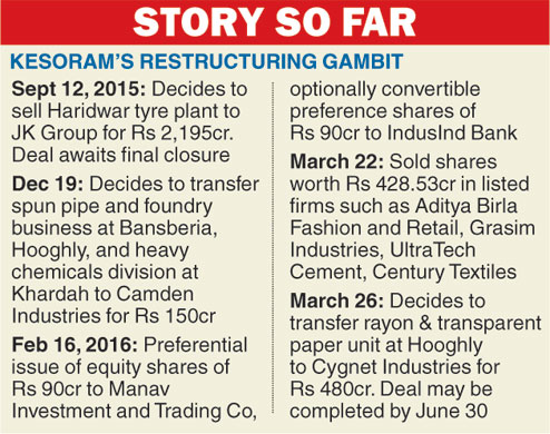 Calcutta, March 26: Kesoram Industries Ltd has decided to transfer the rayon and transparent paper business to unlisted Cygnet Industries in the latest round of restructuring that began with the sale of the tyre plant in Haridwar to JK Tyres in 2015.