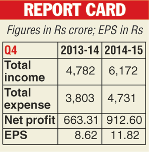 On a standalone basis, net profit shot up 29.4 per cent to Rs 527.14 crore from Rs 407.1 crore for the fourth quarter ended March 2014. Total income rose to Rs 3,249.08 crore from Rs 2,552.96 crore.