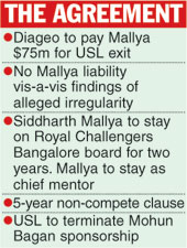 Diageo said it had extended Smirnoff's sponsorship of the Force India Formula 1 team of which Mallya is team principal and part-owner for the next five seasons. Mallya and USL have agreed that USL will not sponsor Mohun Bagan football team and United Racing & Bloodstock Breeders.
