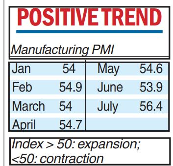 The seasonally adjusted S&P Global India Manufacturing Purchasing Managers’ Index rose to 56.4 in July from 53.9 in June, reflecting the strongest improvement in the health of the sector in eight months.