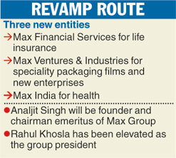 New Delhi, Jan. 15: Listed entity Max India, founded by Analjit Singh, will be split into three - Max Financial Services for life insurance; Max Ventures & Industries for speciality packaging films and new enterprises; and the demerged Max India for health.