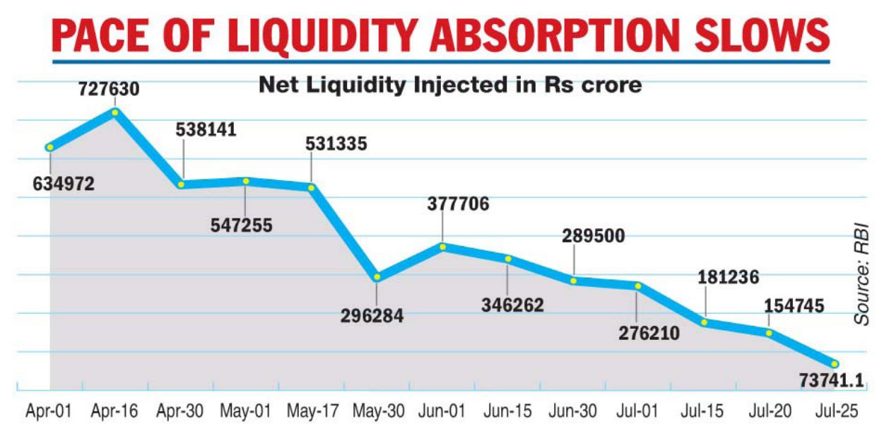 The liquidity as reflected from data on daily absorption from the RBI stood at Rs 73,741 crore as on July 25.