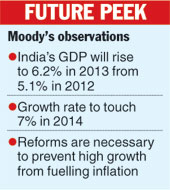 In a report, Moody’s said the country’s gross domestic product (GDP) would rise to 6.2 per cent in 2013 from 5.1 per cent in 2012, and thereafter, touch a new growth trend of 7 per cent from 2014.