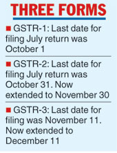 New Delhi: The government has extended the due date by a month for the filing of July GSTR-2 to November 30 and GSTR-3 to December 11. The extension will help about 30.81 lakh taxpayers, the finance ministry said in a statement.