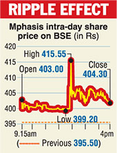 The announcement led to the shares of Mphasis finishing at Rs 404.30 on the BSE, a gain of over 2 per cent from the previous close.
