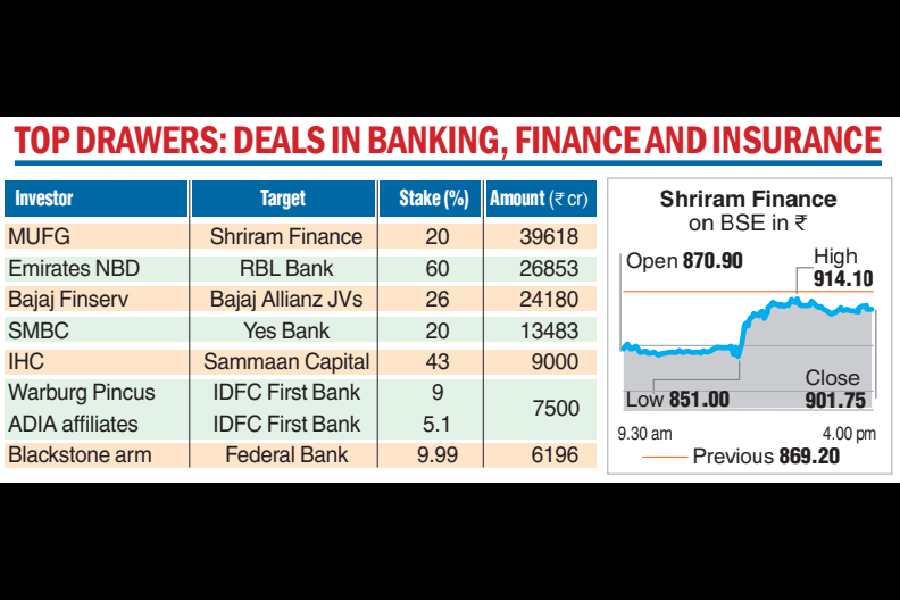 MUFG’s proposed investment in Shriram Finance trumps the previous biggest deal in the banking and financial services sector, where Emirates NBD Bank, the second-largest bank in the UAE, had expressed interest in acquiring a 60 per cent majority stake in RBL Bank for ₹26,853 crore. It marks a strong year of foreign investor interest in India’s financial services sector (see chart).