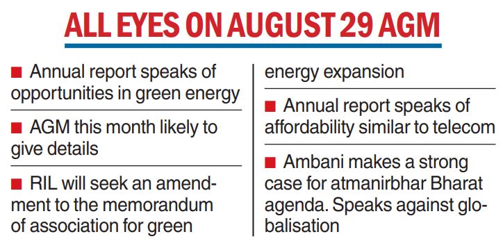 Ambani is expected to spell out the group’s strategy at the annual general meeting to be held on August 29. “Reliance will develop endto-end green energy solutions, which will make clean and abundant energy available to everyone at the most affordable price. Just as India has the world’s most affordable wireless broadband today, we will have the world’s most affordable green energy within this decade. And these solutions will then be exported to other countries, helping them contain carbon emissions.”
