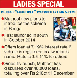 Mumbai, Jan. 31: Buoyed by the success of its "ladies only" two-wheeler loans in south India, Muthoot Capital Services - the flagship company of Kerala-based Muthoot Pappachan Group - is planning to introduce the scheme in Bengal.