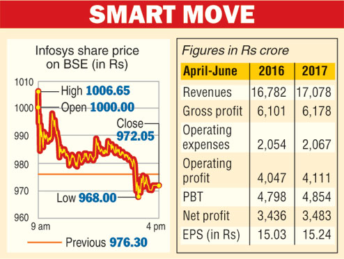 Mumbai, July 14: Infosys today beat Street expectations as new services and strong execution saw the company reporting a 1.3 per cent rise in first-quarter net profit while raising the annual revenue guidance in US dollar terms.
