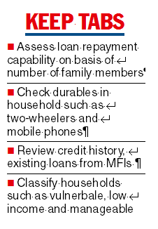 These are in addition to the credit history and indebtedness assessment, which looks at the number of MFIs where the borrower has outstanding loans, monthly repayment outgo, instances of late payment and NPA, adherence to group norms among others.