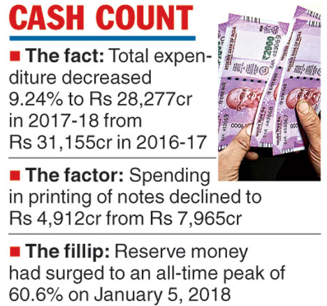 In its annual report, the central bank, which follows a July-June financial year, said its total expenditure decreased 9.24 per cent to Rs 28,277 crore in 2017-18 from Rs 31,155 crore in 2016-17 primarily because of the decrease in expenditure on printing notes.