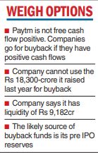 One 97 Communications Ltd, the operator of India’s largest digital paymentsprovider Paytm, cannot useproceeds of its mega initialpublic offering (IPO) for theproposed repurchase of itsown shares, as rules prohibitsuch a move, sources said, adding the firm will use its strongliquidity for the purpose.
