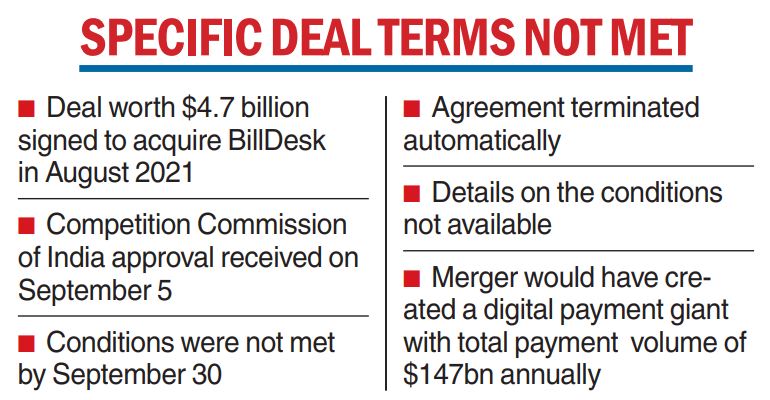 Prosus NV, the PayU parent, has terminated a $4.7 billion deal to acquire Indian payments firm BillDesk after conditions on the deal were not met.